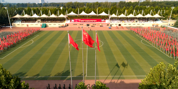 红旗飘扬,如似火年华,如胜利凯歌,红旗方队表演中,一面面“奔跑”的红旗迎风招展,猎猎作响,象征着铁院学子血液里迸发的澎湃热情,为军训会场打亮了鲜艳的底色。
