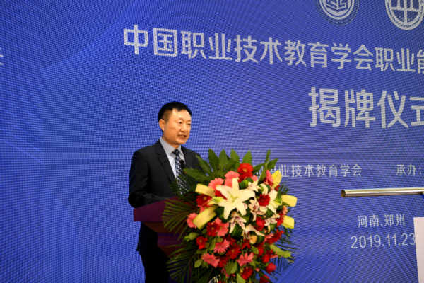 在全场嘉宾的见证下,中国职业技术教育学会会长、教育部原副部长鲁昕,中国职业技术教育学会副会长、河南省人大常委会教育科学文化卫生工作委员会主任、河南省教育厅原厅长朱清孟,河南省教育厅党组成员、副厅长陈垠亭,学校党委书记苏东民、校长孔凡士共同为中国职业技术教育学会职业能力重构研究中心揭牌。