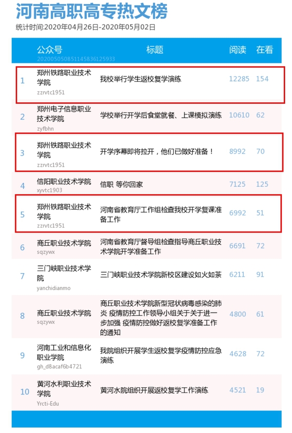 近日,由河南省教育新媒体暨舆情研究中心发布的河南省教育系统两微综合传播力排行榜出炉,我校官方微信推送校党委关于疫情防控工作部署和安排在河南高职高专微信榜TOP10排名中位列第一;在河南高职高专热文榜TOP10排名中,我校《我校举行学生返校复学演练》、《开学序幕即将拉来,他们已做好准备!》《河南省教育厅工作组检查我校开学复课准备工作》三篇推文分别位列第一、第三、第五。