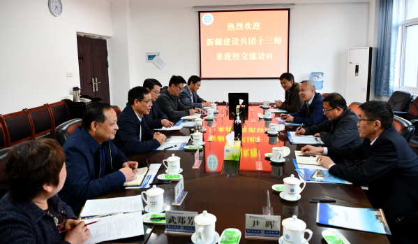 11月11日下午,新疆建设兵团十三师教育局局长姜宗军、副局长闫治国、兵团十三师职业技术学校校长曹明、副校长李矿、河南省教育厅职业教育与成人教育处四级调研员王凯一行8人到我校访问交流对口支援工作。党委书记许琰,党委副书记、纪委书记谢乾,副校长倪居接待了来访客人,教务处、校地结对帮扶办公室、艺术学院参加了交流。