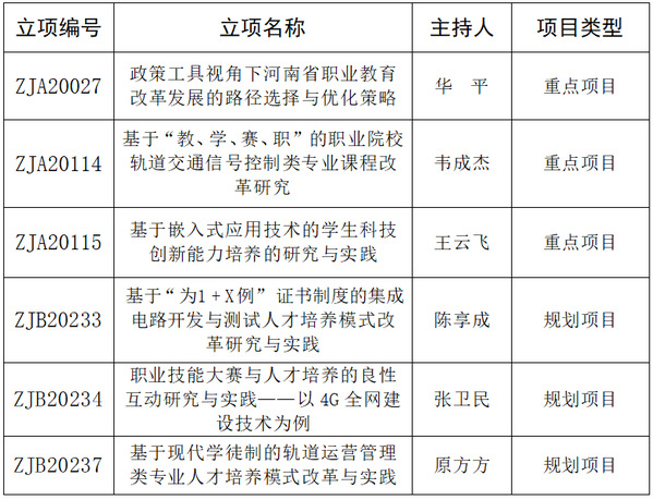 近日,河南省教育厅下发《关于2020年河南省职业教育教学改革研究与实践项目立项项目的通知》(教职成[2020]487号)文件,我校有6个项目获得立项,其中重点项目3个、规划项目3个。