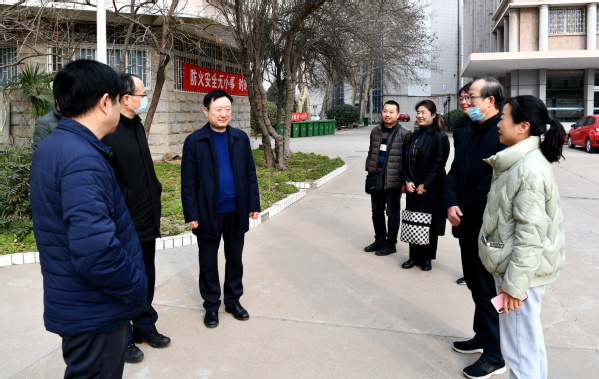 许琰、孔凡士、谢乾、董黎生一行分别来到新校区和幸福校区的干部值班室、门卫室、监控室和食堂等地方,还观摩了学校大门张贴的新春对联和悬挂的红灯笼。“大家辛苦了,祝你们春节快乐!”每到一处,他们都与在岗的工作人员一一握手、亲切交谈,详细询问寒假期间校园安保、餐饮、疫情防控、后勤保障等工作情况和值班人员生活情况。