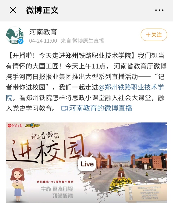 4月24日上午11点,河南日报“记者带你进校园”大型直播活动,走进郑州二七纪念塔,直播了我校一节别样的思政课,讲述我校将思政小课堂融入社会大课堂、融入党史学习教育,培养有情怀的未来大国工匠。