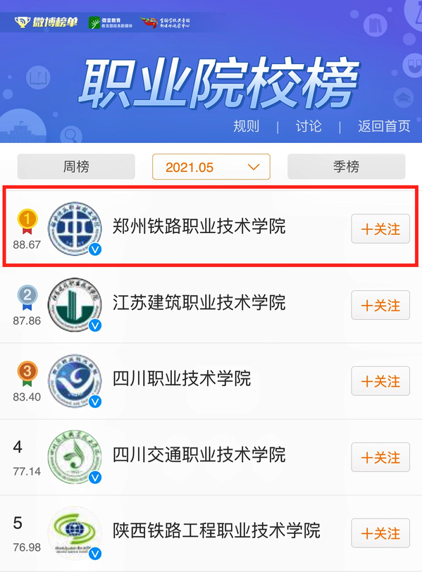 近日,由教育部政务新媒体官方微博“微言教育”和全国学校共青团新媒体运营中心联合发布的“微博校园榜”阶段排名数据显示,我校官方微博在全国职业院校官方微博月排行榜单中,综合得分88.67分,位居全国第1位。