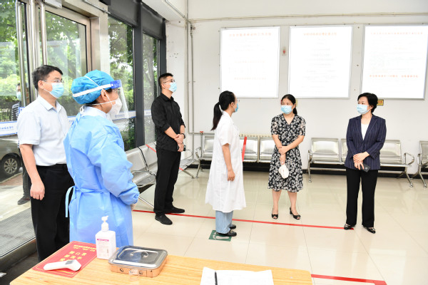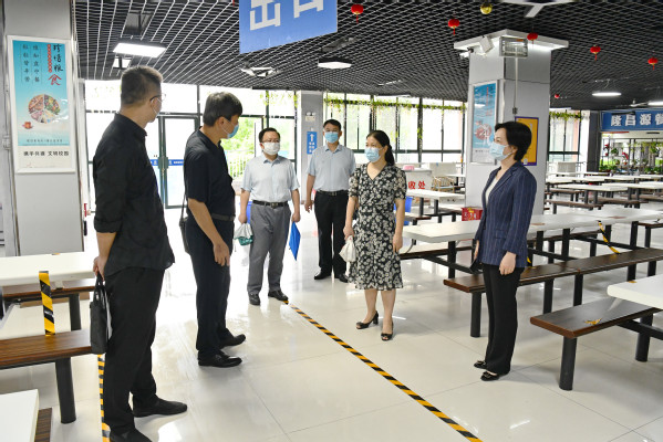 季双丽一行先后来到学校隔离区、学生宿舍、学生餐厅、防疫物资存放点等重点场所,实地查看公共区域体温检测、重点区域清洁消毒、留校学生及工作人员个人防护等疫情防控措施落实情况,详细了解了留校学生封闭式管理、生活服务保障、校园基础设施灾后恢复和秋季开学准备情况。