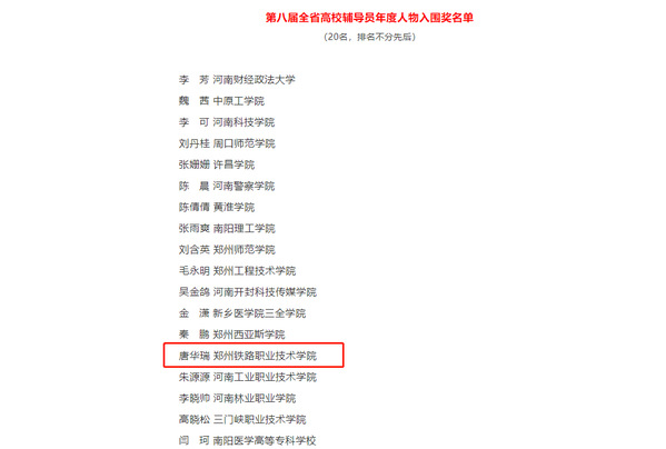 本次评选由中共河南省委高校工委、省教育厅主办,旨在激励广大辅导员认真履行立德树人崇高使命,宣传优秀辅导员的先进事迹。经学校推荐、材料评审、网络答辩、综合评议等环节,全省高校共有10名辅导员荣获“第八届全省高校辅导员年度人物”,10名辅导员获提名奖,20名辅导员获入围奖。