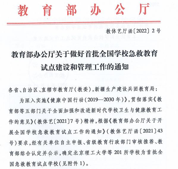 近日,教育部下发《关于做好首批全国学校急救教育试点建设和管理工作的通知》(教体艺厅函〔2022〕2号)。经省级教育行政部门审核推荐、教育部综合认定公示,我校成为河南省六所首批全国急救教育试点学校之一。