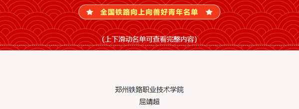 日前,在全国铁道团委组织的2021年度“全国铁路向上向善好青年”评选中,我校动车技术19A2班樊路欣同学、铁道机车19Y3班屈靖超同学分别获得“勤学上进好青年”和“崇德守信好青年”荣誉称号。