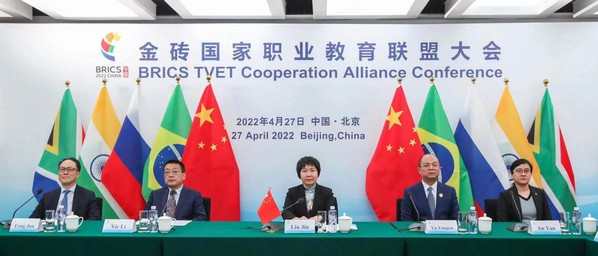 为落实习近平主席在金砖国家领导人第十三次会晤上提出的建立金砖国家职业教育联盟的倡议,4月27至28日,由中国教育部主办,中国教育国际交流学会承办、宁波职业技术学院协办的金砖国家职业教育联盟大会在北京以线上线下相结合形式召开。金砖五国职业教育主管部门、驻华使节、行业组织、职业院校和企业代表共百余人出席会议,共同见证金砖国家职业教育联盟正式成立。