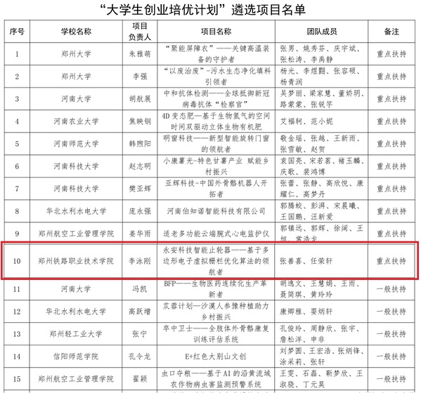5月5日,“创响中原”2022年河南省大学生创业培优计划项目评审结果公布,我校大学生创业项目“永安科技智能止轮器”入选河南省大学生创业培优计划重点扶持项目。这是我校首次入选河南省大学生创业培优计划,也是本次入选重点扶持项目的唯一高职院校。