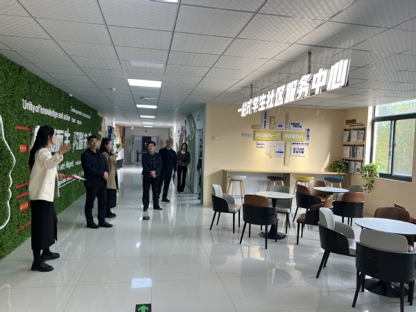 刘颖民一行首先参观了书院文化育人基地、红船书吧、“一站式”学生社区服务中心、辅导员工作室等,深入了解了天使书院“一站式”学生社区育人工作的经验和做法。