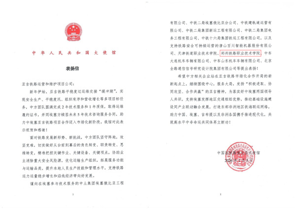 新年伊始,中华人民共和国驻埃塞俄比亚大使馆向亚吉铁路运营和维护项目公司及相关合作单位发出表扬信,对我校在支持亚吉铁路安全运营中作出的积极贡献予以充分肯定和表扬。