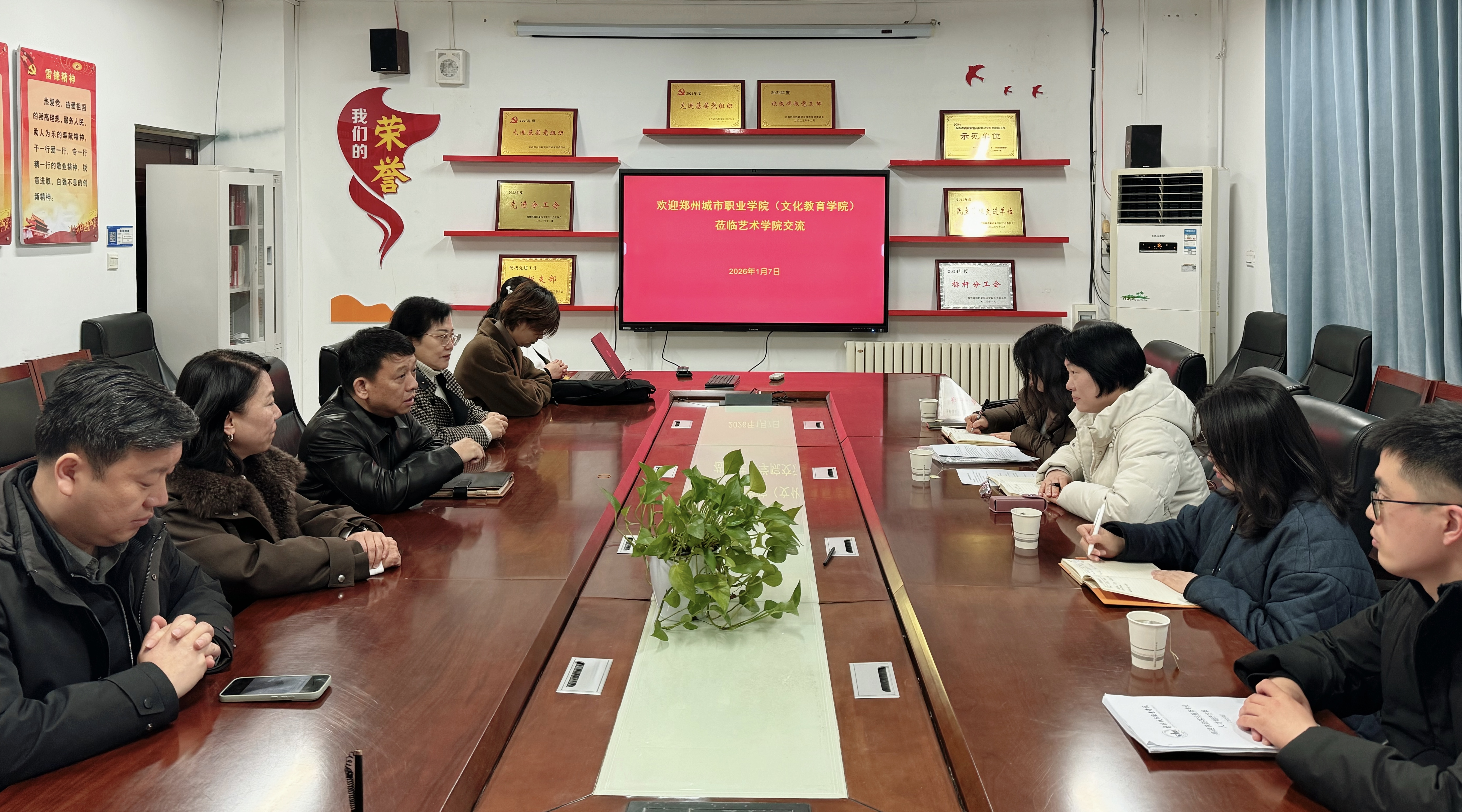 1月7日,郑州城市职业学院文化教育学院院长王洪、现代乘务系主任张新会、高速铁路客运服务专业负责人刘婷婷及骨干教师魏振一行莅临我校艺术学院,艺术学院领导班子和交通乘务教研室教师参加会议。双方就高速铁路客运服务专业建设、人才培养模式及校企合作等方面展开深入交流。
