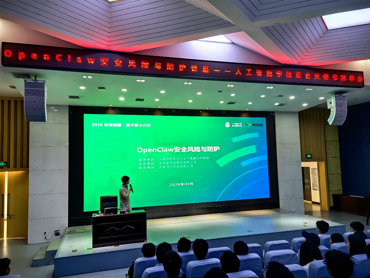 为深化校企合作,拓宽学生专业视野,紧跟人工智能前沿技术发展,4月14日下午,由人工智能学院、天使书院联合主办的“OpenClaw安全风险与防护”专题讲座在我校第二报告厅成功举行。本次讲座特邀深信服科技股份有限公司和河南网训教育科技有限公司的资深信息安全专家主讲,讲座围绕当前备受关注的“OpenClaw”的安全风险与防护主题展开深度分享。来自信息安全、物联网、人工智能、计算机等专业的近300多名师生齐聚一堂,共同参与了这场知识盛宴。