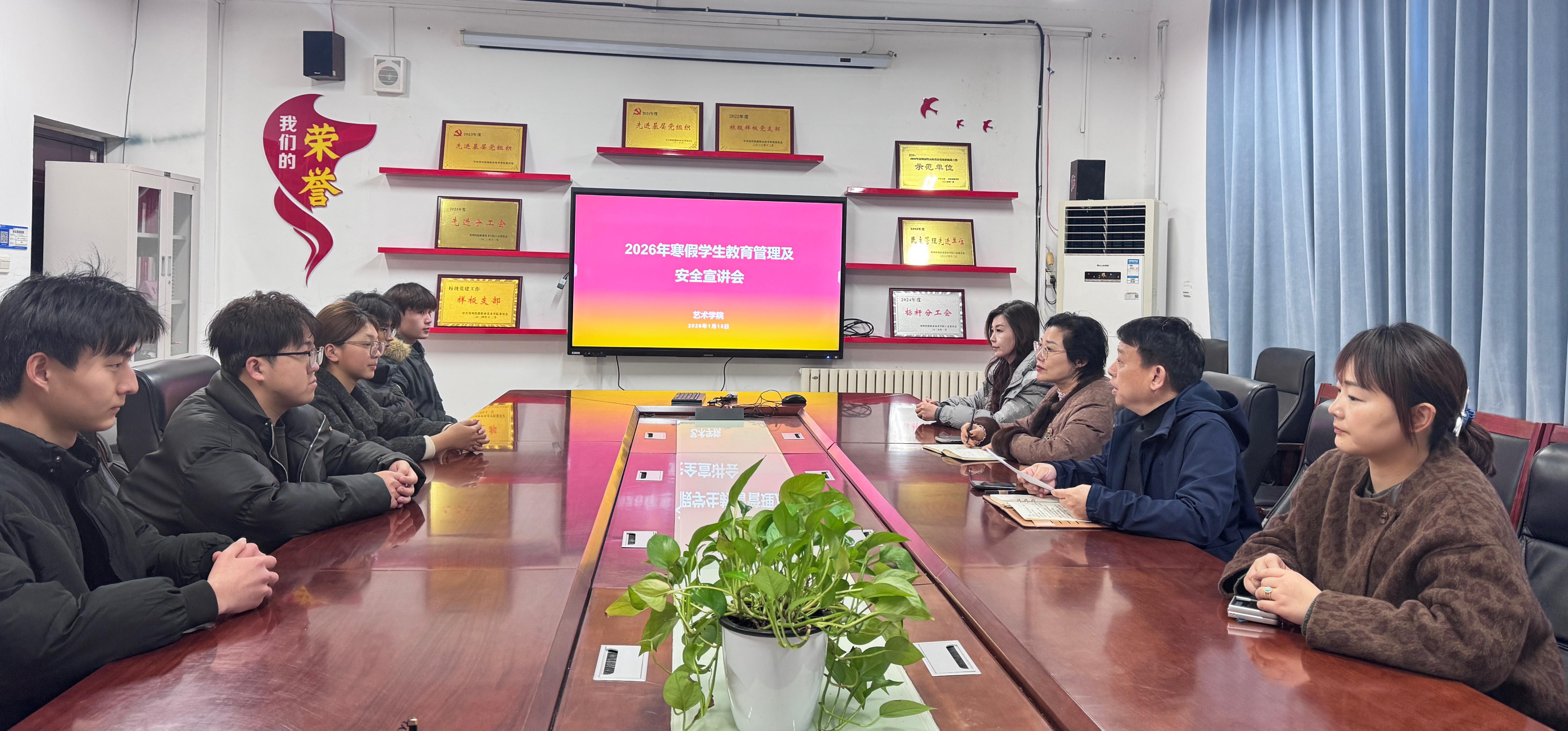 为深入贯彻落实学校假期学生留校管理制度,做好寒假期间留校备赛学生的教育管理与安全保障工作,艺术学院于1月15日组织召开了《2026年寒假学生教育管理及安全宣讲》专题会议。艺术学院党总支书记薛燕、院长邹联丰、指导教师及全体寒假留校备赛学生参加了会议。