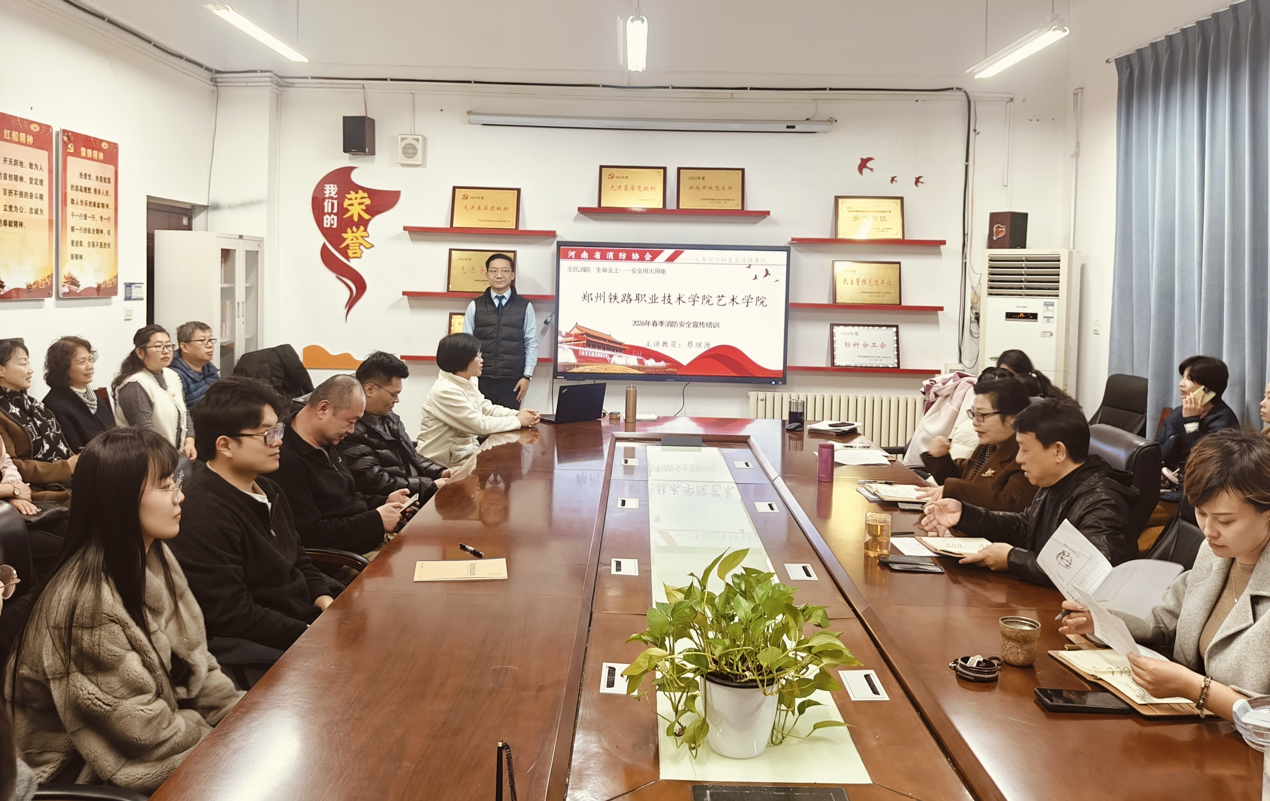 为严格落实校园安全管理工作要求,切实强化全体教职工消防安全意识,全面夯实校园安全稳定根基,2026 年 3 月 17 日下午,艺术学院在 1316 会议室顺利举办 2026 年上半年消防安全培训暨应急演练活动,艺术学院全体教师参与此次专题安全教育。