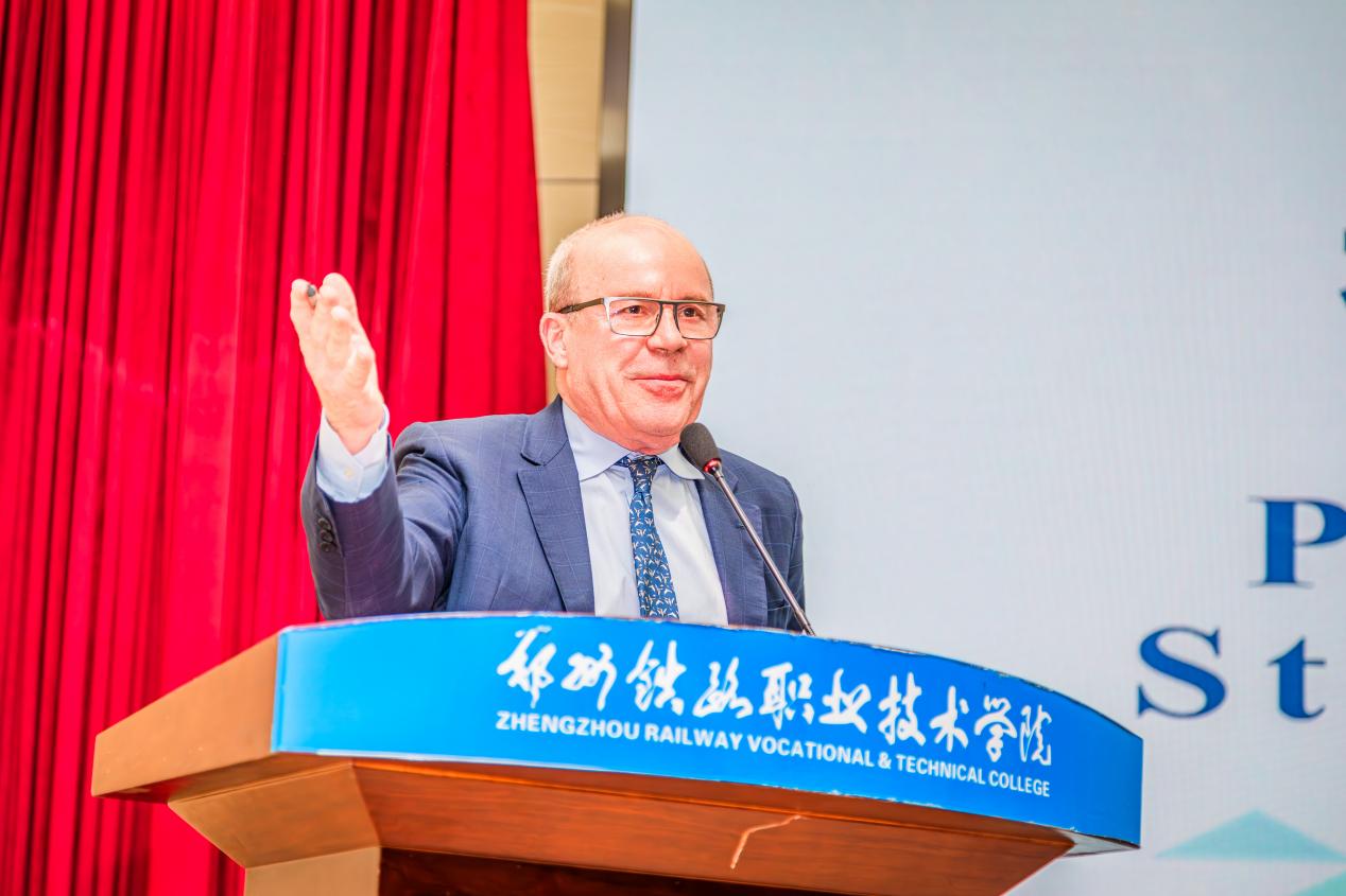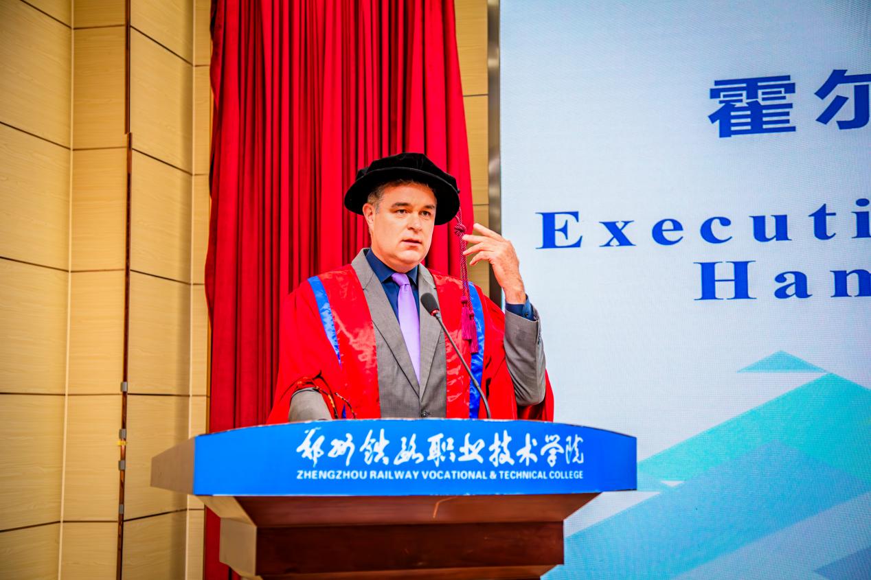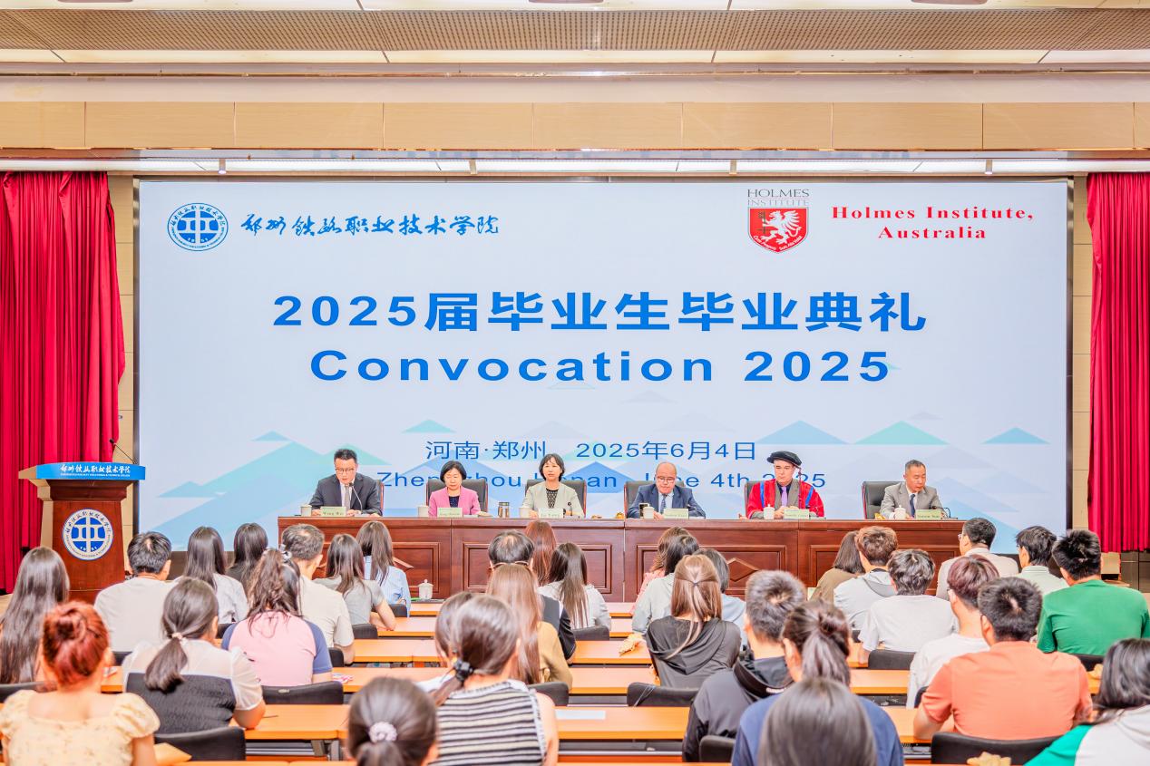 On the morning of June 4, ZZRVTC held 2025 graduation ceremony for the Sino-Australian joint education program in the First Lecture Hall of the new campus. Vice President Lu Yanqi attended the ceremony. Stephen, Chairman of Holmes Education Group (Australia), Kou Haiming, Executive Dean, Sun Yi, Director, as well as heads and teachers and students from the International Exchange and Cooperation Office, School of Transportation Management, School of Business, and Silk Road Academy (International Education School) of ZZRVTC attended the ceremony. The ceremony was presided over by the head of the Silk Road Academy (International Education School).