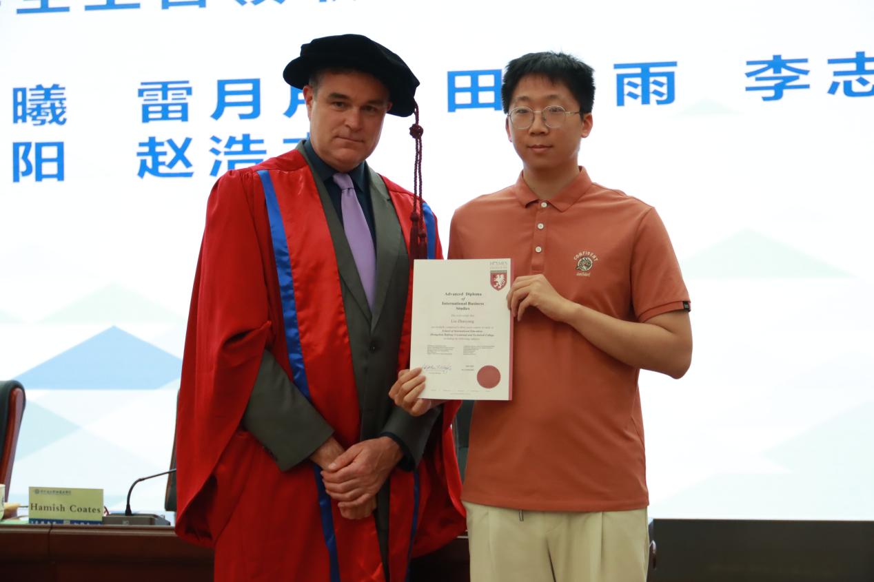 At the ceremony, the head of the International Exchange and Cooperation Office announced the list of outstanding graduates. Lu Yanqi and Kou Haiming presented graduation certificates from both sides to the graduates.