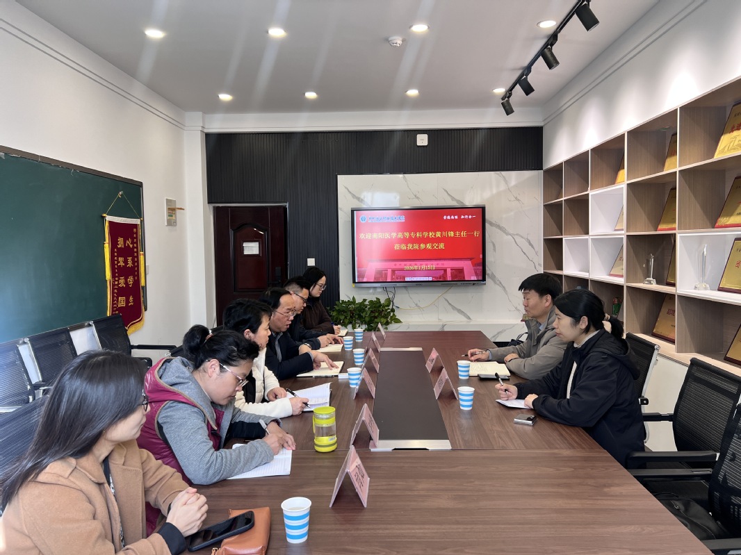 2026年1月15日,南阳医学高等专科学校医学技术系主任黄川锋、眼视光技术教研室主任耿若君一行来我校医学技术与工程学院交流。医学技术与工程学院党总支书记刘意接待了来访嘉宾,医学技术与工程学院副院长孟令杰、医学技术与工程学院教学科研办公室主任齐园圃,以及相关专业教研室主任与专业带头人出席会议。