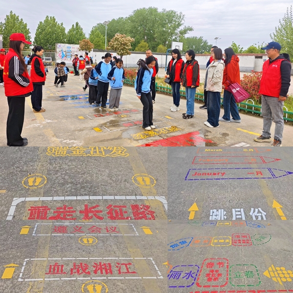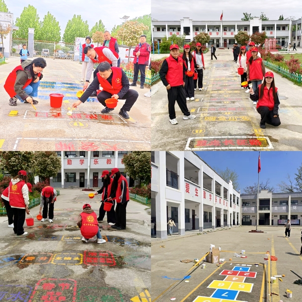 艺术学院党员白玉成及景仲龙(目前为驻村工作队员)带领建筑装饰和室内设计专业学生开展现场施工教学,教师党员志愿服务队也一起开展校园墙地面美化活动。艺术学院充分发挥专业优势,结合党建红色文化元素、传统文化、英语、安全、二十四节气等元素,精心绘制了一系列色彩鲜明、寓教于乐的图案,在图案上可以开展体育活动,如跳格子、跳远等游戏。另外,还做了社会主义核心价值观的宣传栏。不仅美化了校园环境,更在活动中传递了红色文化、中华优秀传统文化以及安全教育知识等,让孩子们在潜移默化中受到熏陶与教育。