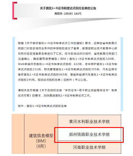 近日,教育部职业技术教育中心研究所发布《关于首批1+X证书制度试点院校名单的公告》(教职所〔2019〕141号)文件,我校成功入选建筑信息模型(BIM)首批1+X证书制度试点院校,铁道工程学院的铁道工程技术专业将作为试点专业参与本次试点工作。