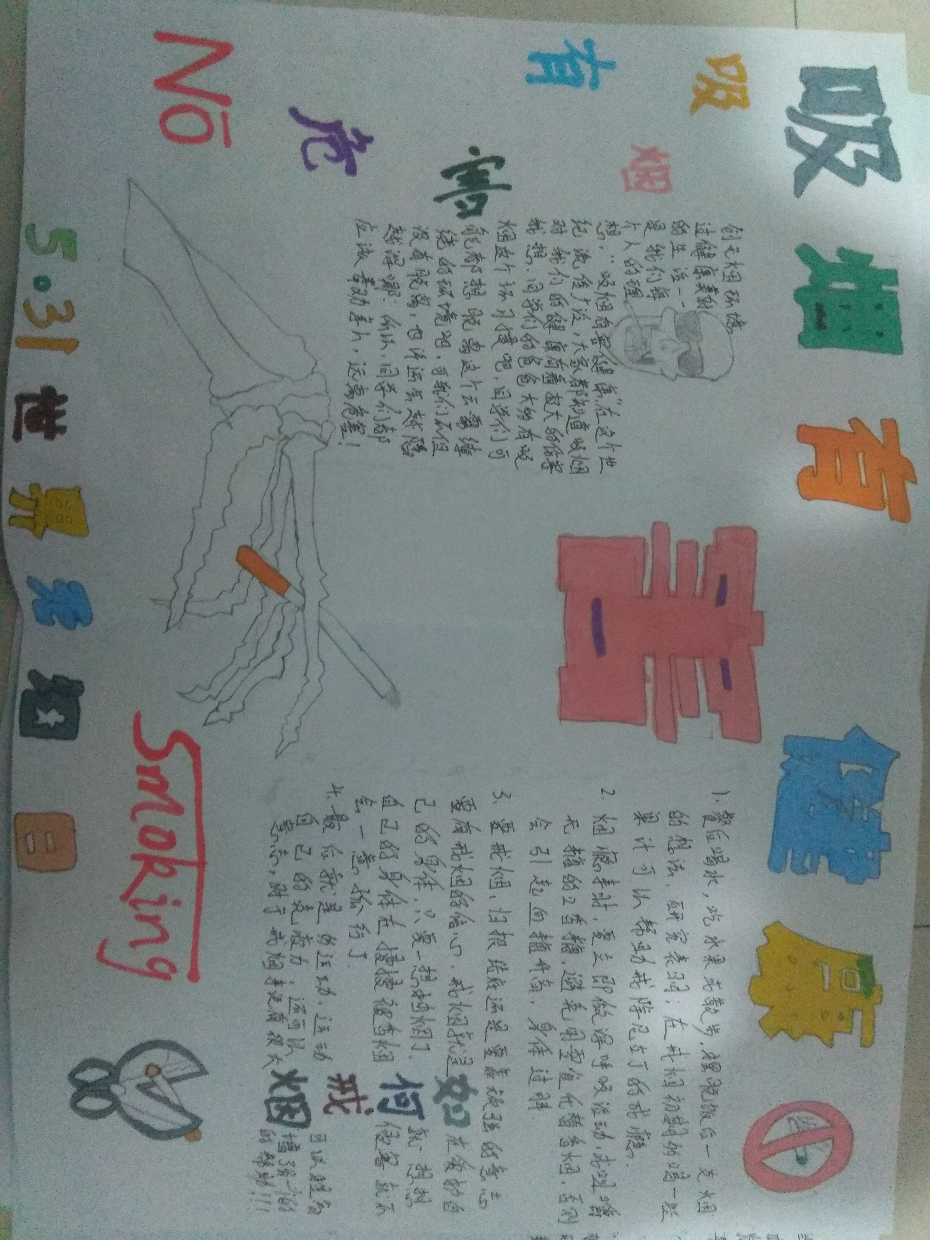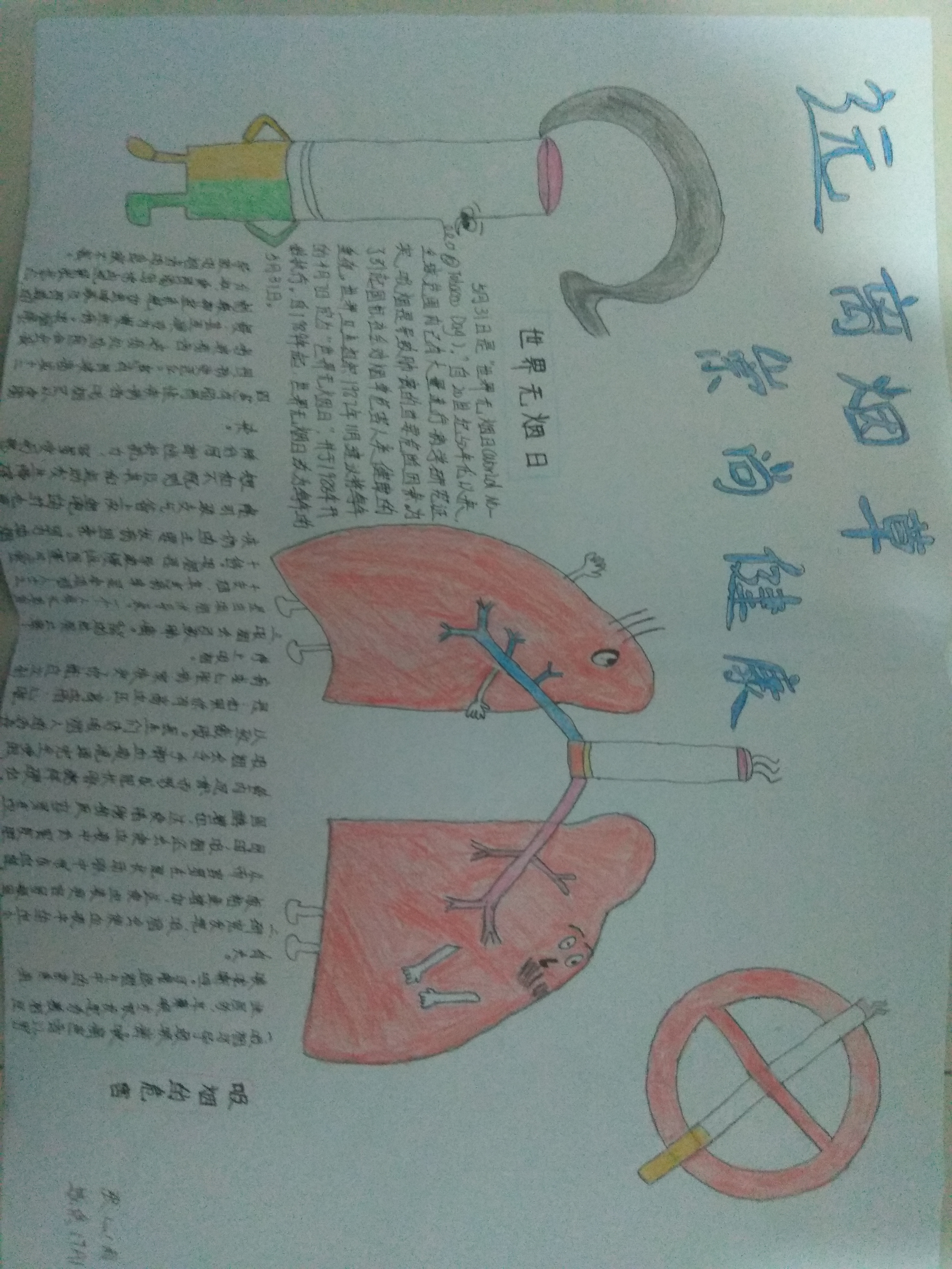 本次活动的手抄报通过从班级征集的方式开展,各个班级的同学发挥自己的想象,通过文字和画笔来表达烟草对人体产生的伤害,以此呼吁大家远离烟草,共创文明。同学们各显神通,以各种创意表达了吸烟与健康的密切关系,上交的作品经过层层筛选,评选出优秀作品,再贴板展出,对于创作出优秀作品的同学给予奖励。