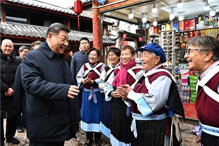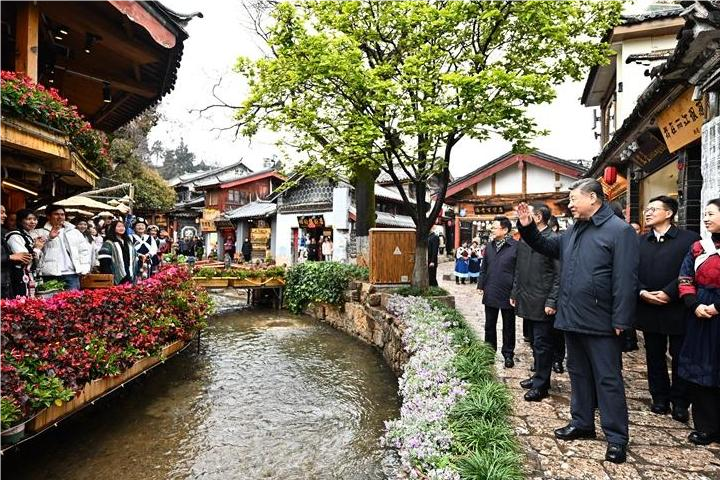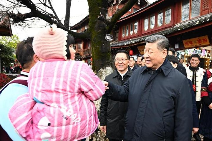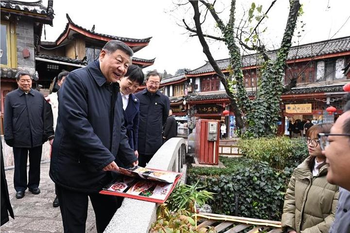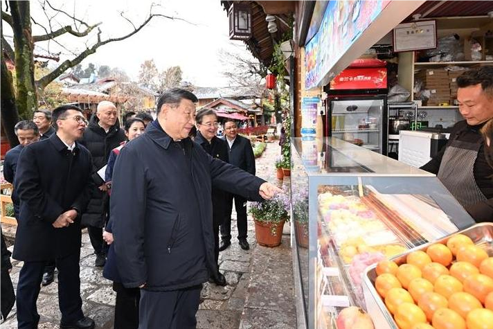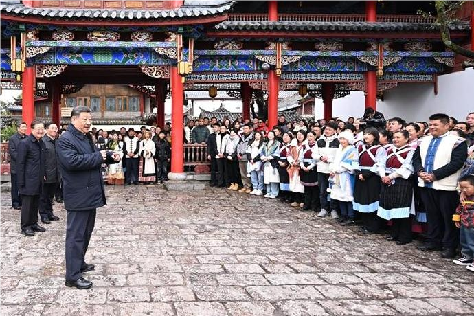 丽江古城有800多年历史,被列入世界文化遗产名录。一场春雪过后,丽江游人如织。习近平来到这里,详细了解古城营建历史、纳西族民居特色和当地文化遗产保护利用、推动文旅融合发展等情况。居民和游客见到总书记十分兴奋,争相问好,有的还弹奏乐器、载歌载舞欢迎总书记。习近平频频与大家互动交流,了解商铺经营状况和游客感受。他要求当地处理好保护和发展的关系,让这座美丽的古城焕发新的光彩。