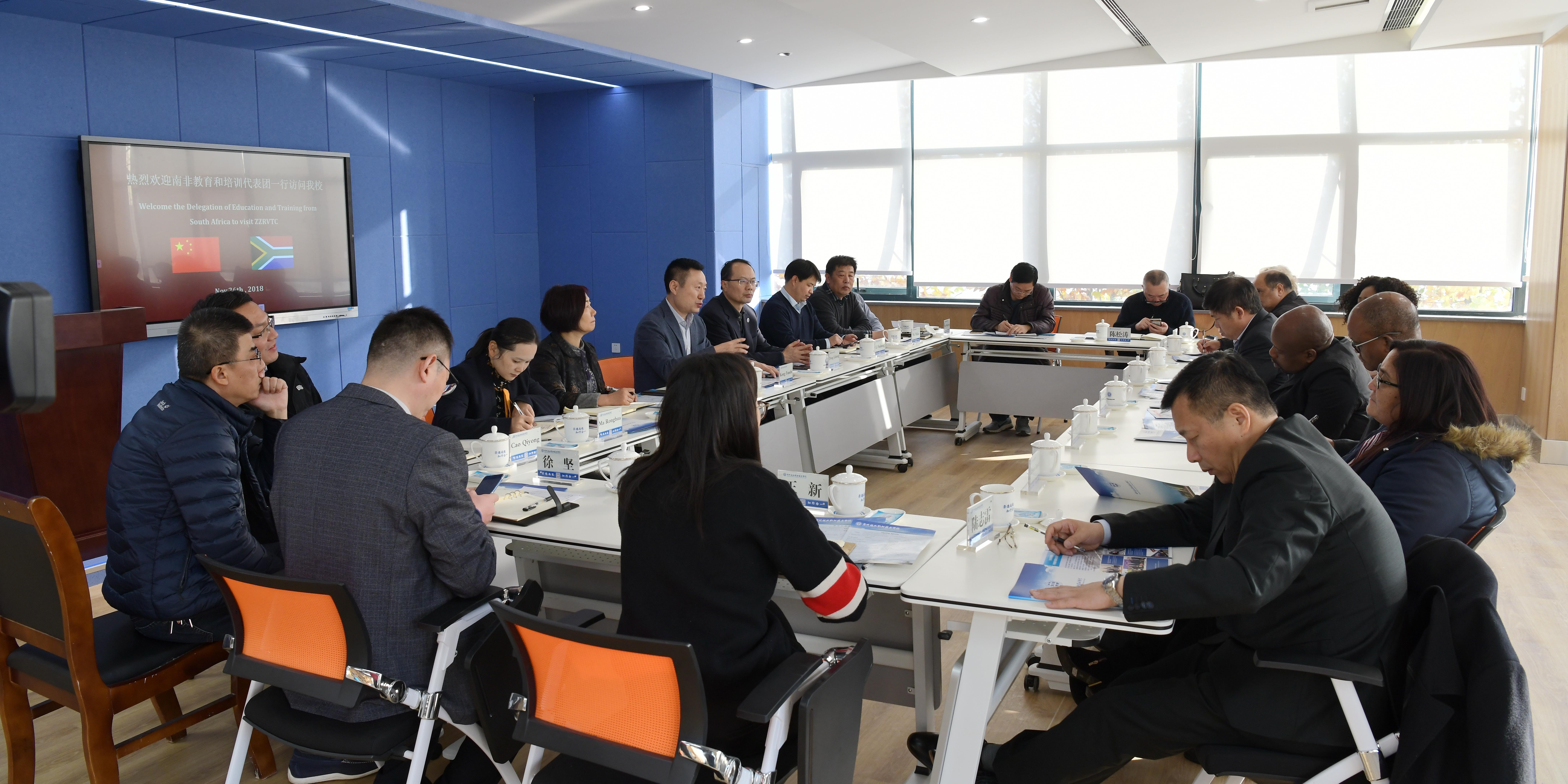 11月26日南非高等教育和培训部建筑业培训署署长罗伯特·赛米亚、南非诺斯林克大学校长列昂·比奇一行8人在河南省教育厅国际处处长徐恒振的陪同下访问我校。校长孔凡士、副校长董黎生和相关部门负责人会见了客人。双方就留学生培养事宜进行了深入坦诚的交流。