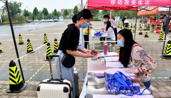 当天早上,在学校东大门,拖着行李、戴着口罩的学生在工作人员的引导下,间隔1.5米以上排队等待、身份核验、行李消杀、体温检测、更换口罩、查验健康码和个人行程查询结果等程序后方可通过。完成报到手续后,领取“防疫健康包”,按照指定路线到达学生公寓,经过二次测温和身份核验后进入宿舍。整个流程有条不紊,井然有序。党员教师组成志愿服务队,分别在东大门、宿舍等处设立党员志愿服务点,积极参与返校复学的各项工作。