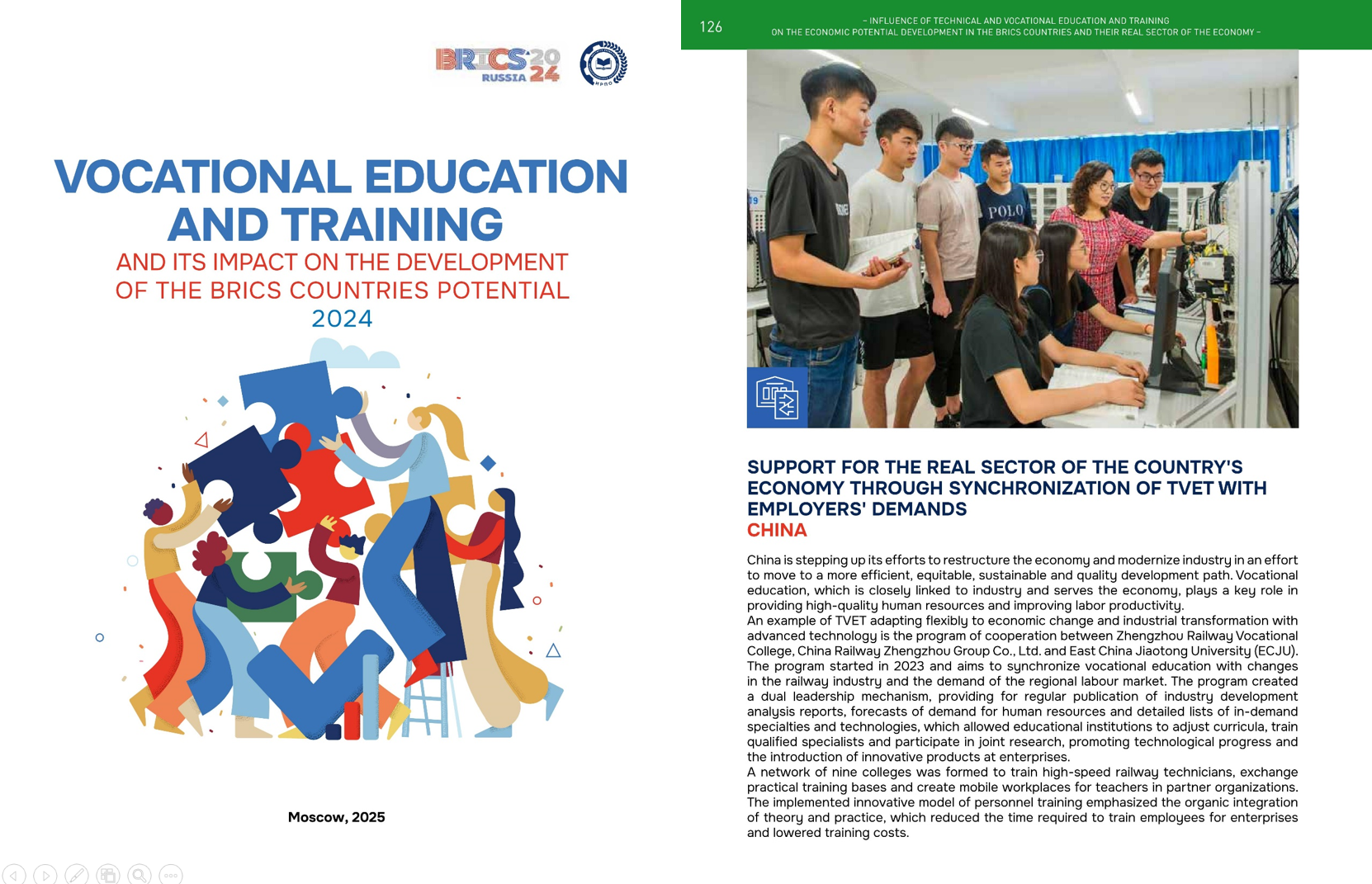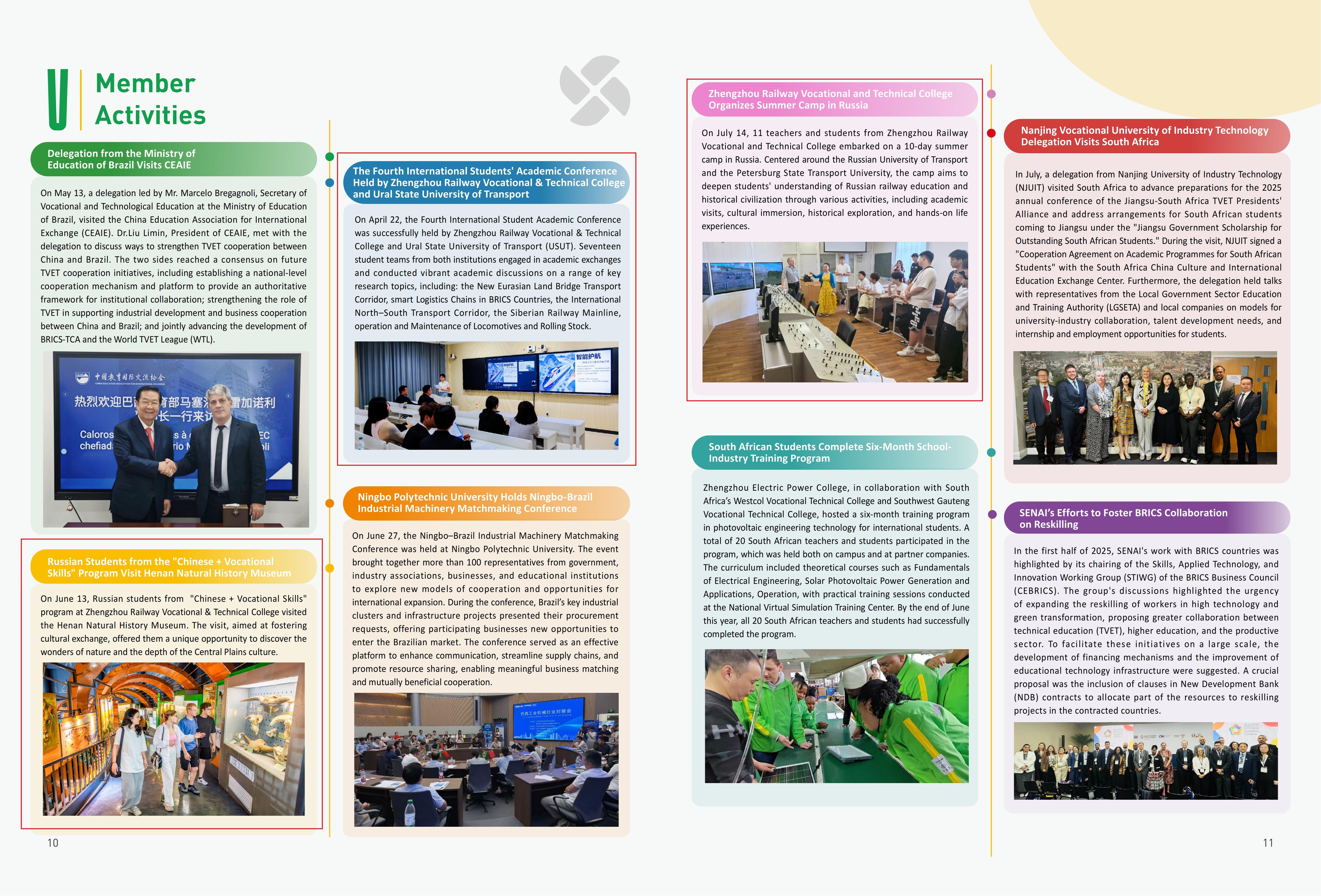 去年6月,金砖国家职业教育联盟会议在巴西举行。我校作为联盟重要成员,在会议中作典型发言,为全球南方国家的职业教育发展提供了切实可行的中国方案。7月,俄罗斯联邦职业教育与培训发展研究院发布《职业教育与培训及其对金砖国家发展潜力的影响》专题研究报告,我校撰写的产教协同育人案例入选其中,体现了学校在推动人才培养模式改革、对接产业发展需求方面所形成的实践成果已进入国际学术研究的视野。此外,我校举办的“第四届国际学生学术会议”、暑期赴俄夏令营以及为乌拉尔国立交通大学学生定制的“中文+职业技能”项目均被收录于联盟年度活动集,展现了我校国际合作形式的丰富性与包容性。