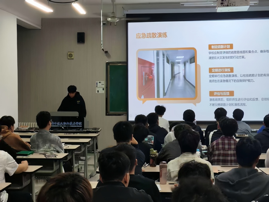 班会筹备阶段,各班负责人提前准备班会材料,涵盖消防知识课件、典型火灾案例视频及逃生演练示意图等,确保班会内容充实、形式规范。班会过程中,各班围绕校园消防安全核心内容展开深入学习:通过课件讲解,系统梳理违规用电、楼道堆放杂物等校园常见火灾隐患,明确消防安全行为规范;结合真实校园火灾案例,剖析事故发生的原因、蔓延过程及造成的严重后果,让学生深刻认识到消防安全的重要性;重点解读火灾报警流程、初期火灾处置要点、不同场景下的逃生注意事项等关键知识,引导学生掌握科学避险方法。此外,各班还通过观点交流等形式,让学生分享对消防安全的认知与思考,进一步加深对所学知识的理解和记忆。