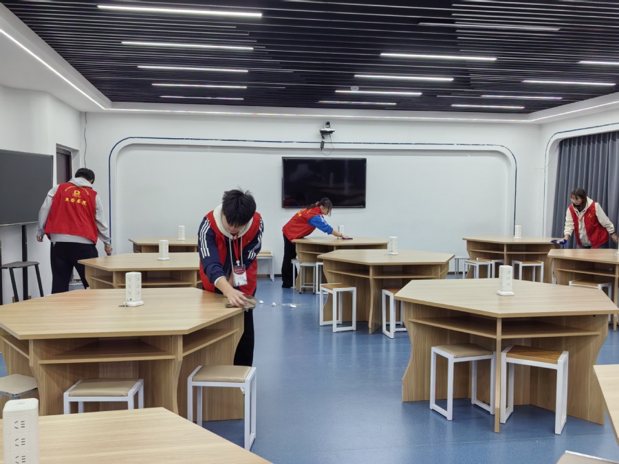 活动当天,身着红色马甲的志愿者们在负责人的统筹下明确分工:有的专注清理教室地面垃圾,将桌椅、窗户擦拭得焕然一新;有的负责角落卫生;还有的手持抹布细致擦拭实训设备的操作面板与实验台,确保精密仪器洁净无尘。面对繁琐的清洁工作,志愿者们干劲十足,往返穿梭于实训室与教室之间。