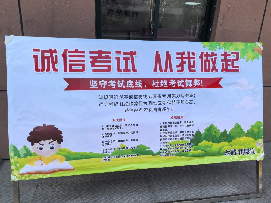 营造良好氛围,做好宣传报道。精心制作主题鲜明的诚信考试宣传展板,传递“以诚信为荣、以作弊为耻”的价值追求,让丝路学子在潜移默化中接受诚信教育,营造出浓厚的诚信备考氛围。