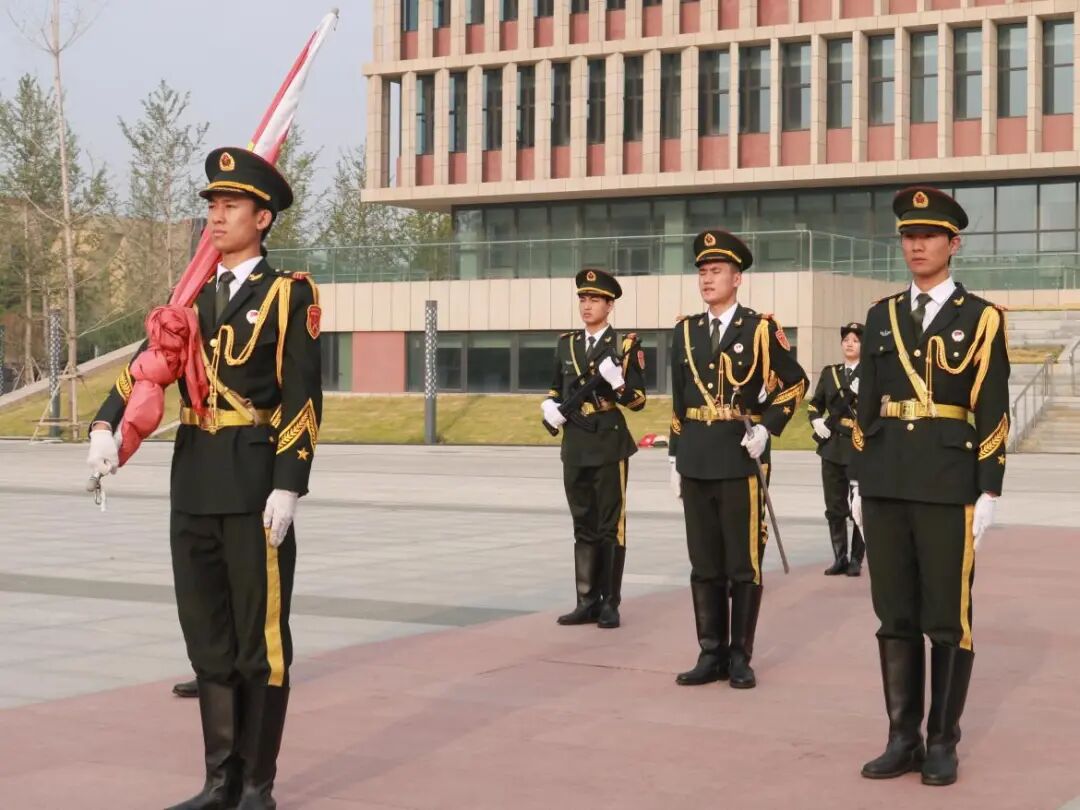 国旗护卫队昂首阔步,步履铿锵,高举五星红旗,向着升旗台阔步前行。国歌声响起,护卫队队员利落展开国旗,五星红旗迎风招展。全体师生肃立,向国旗致以崇高的敬意。