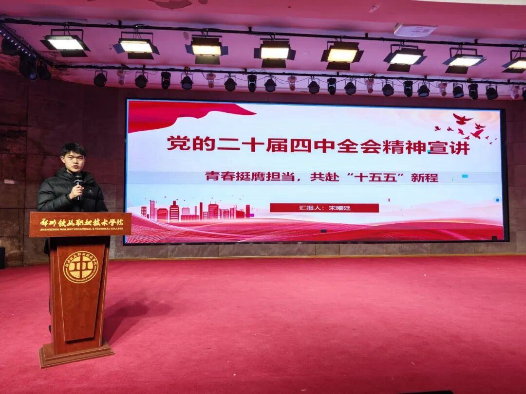 为深入学习宣传贯彻党的二十届四中全会精神,引导广大团员青年将思想和行动统一到党中央决策部署上来,推动全会精神在青年群体中入脑入心、落地生根,近日,我校团委举办专题宣讲会,特邀我校毕业生郑州铁路局优秀青年代表赵钰、校学生会主席宋曜廷担任主讲,围绕全会核心要义与实践要求,面向全校团学骨干展开了多场内容丰富、生动深刻的主题宣讲。