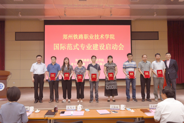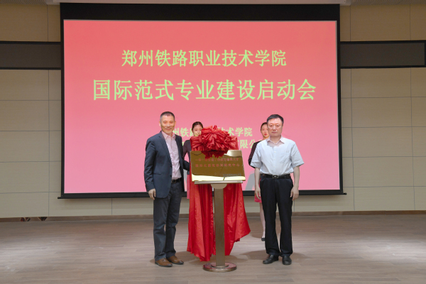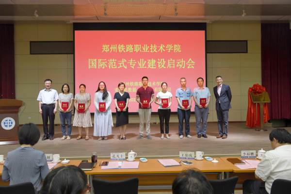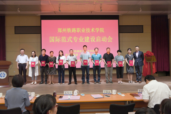 孔凡士校长和王伯庆总裁共同为“一带一路背景下轨道交通类人才国际化建设协同研究中心”揭牌,宣告项目正式启动,并为铁道机车、铁道供电技术、动车组检修技术三个试点专业的核心小组成员颁发聘书。国际范式试点专业建设核心成员代表李建龙进行了发言。