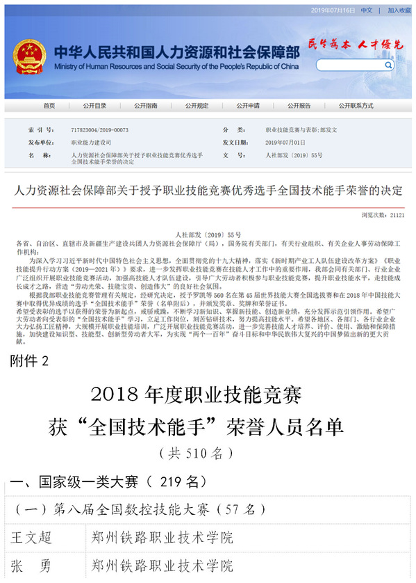 近日,人力资源社会保障部发布文件《人力资源社会保障部关于授予职业技能竞赛优秀选手全国技术能手荣誉的决定》(人社部发〔2019〕55号)。我校机电工程学院张勇、王文超两名教师被授予“全国技术能手”荣誉称号。