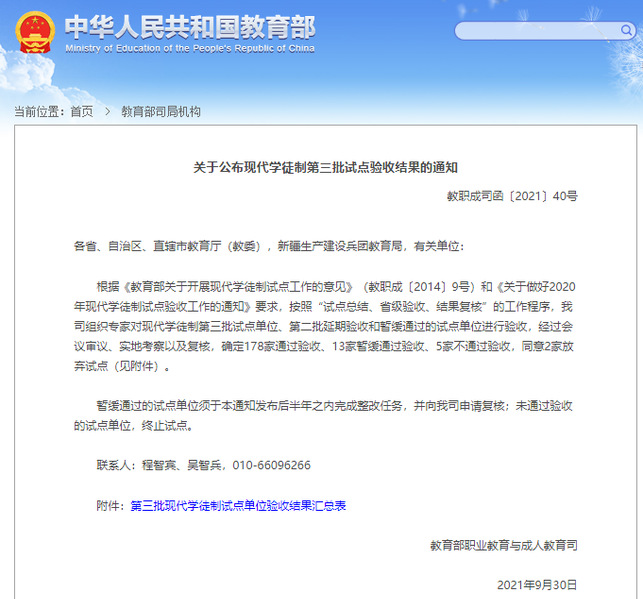 近日,根据教育部《关于公布现代学徒制第三批试点验收结果的通知》(教职成司函〔2021〕40号)精神,我校作为教育部第三批现代学徒制试点院校,顺利通过验收。