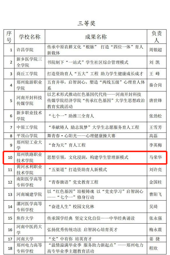 根据河南省教育厅《关于组织开展2021年普通高等学校学生工作优秀成果展演活动的通知》(教办学〔2021〕156号)要求,经各高校推荐,省教育厅组织专家评审、通过网络评审、专家评议、现场展示、专家终审等环节,我校“思想引领,文化浸润,构建学生管理新模式”项目荣获2021年普通高等学校学生工作优秀成果三等奖。